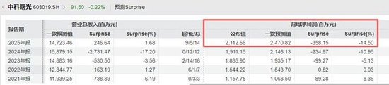 然而,Wind金融终端数据显示,中科曙光2025年21.13亿元的归母净利润,不及14家机构给出的一致预测值(约24.7亿元)。