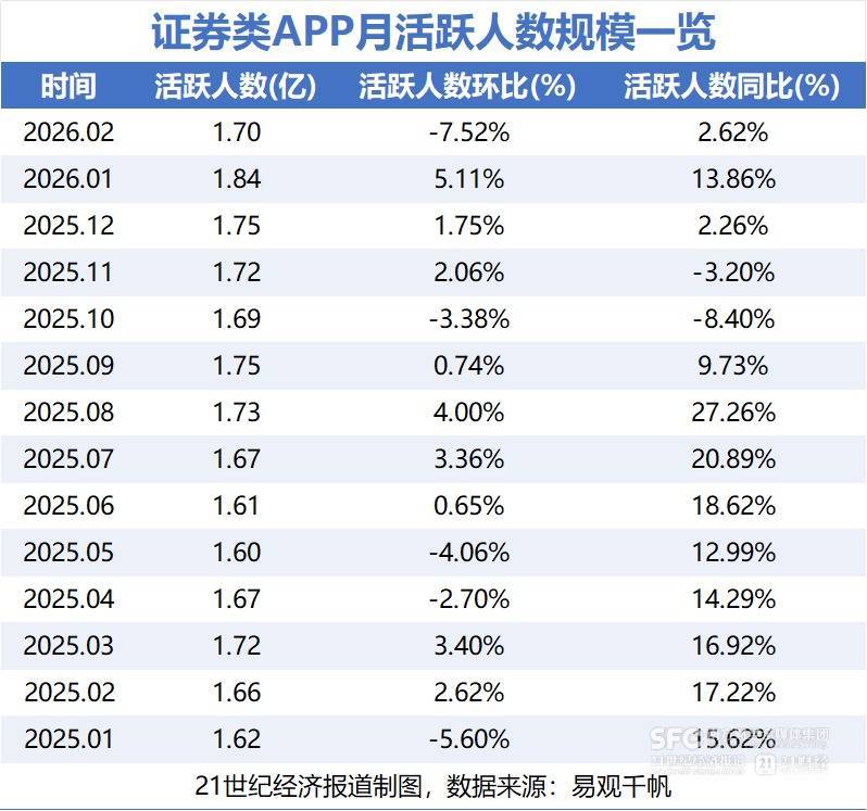 易观千帆最新披露数据显示,2026年2月证券类App活跃用户数(简称“月活”)达1.70亿,环比减少7.52%,同比增长2.62%。受春节长假影响,2月仅14个交易日,导致月活规模环比回落。